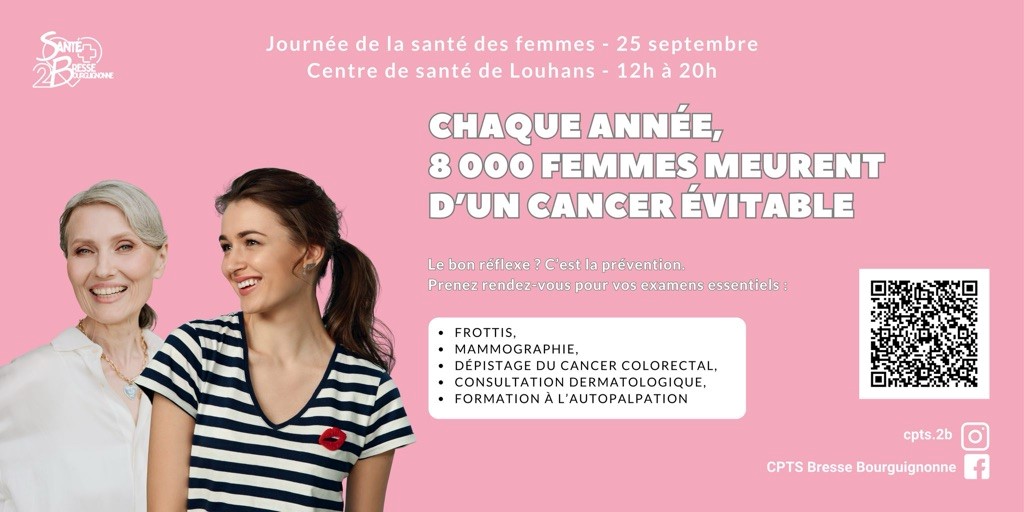 Le 25 septembre, la CPTS de Bresse organise une journée entièrement dédiée à la santé des femmes qui se déroulera au Centre de santé de Louhans et au Centre Hospitalier de la Bresse Louhannaise ( au rez de chaussée de l’hôpital et à la Maison Médicale de Garde sur le site du Centre Hospitalier).