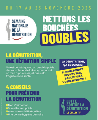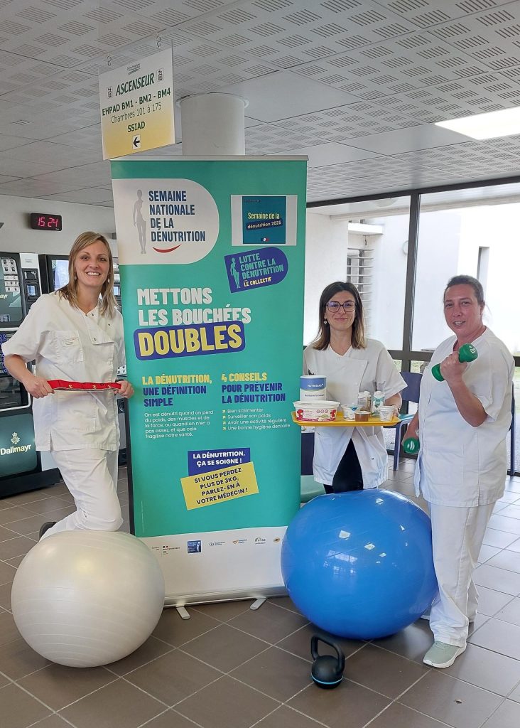 La Semaine de la Dénutrition qui a lieu du 17 au 23 novembre 2025 est un temps fort de prévention et de sensibilisation au sein de l’EHPAD et du service de soins médicaux et de réadaptation (SMR). Des affiches et des flyers sont disponibles pour les familles, les résidents, les patients et les professionnels sur les enjeux de la dénutrition, qui un problème fréquent mais souvent silencieux chez les personnes âgées et les personnes en rééducation. En SMR, des flyers seront distribués sur les plateaux repas ce jeudi 20 novembre.